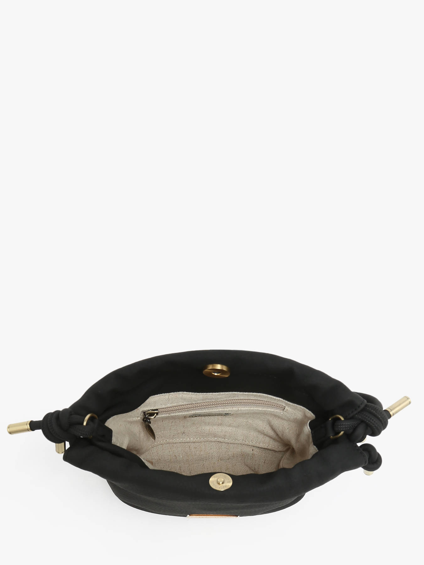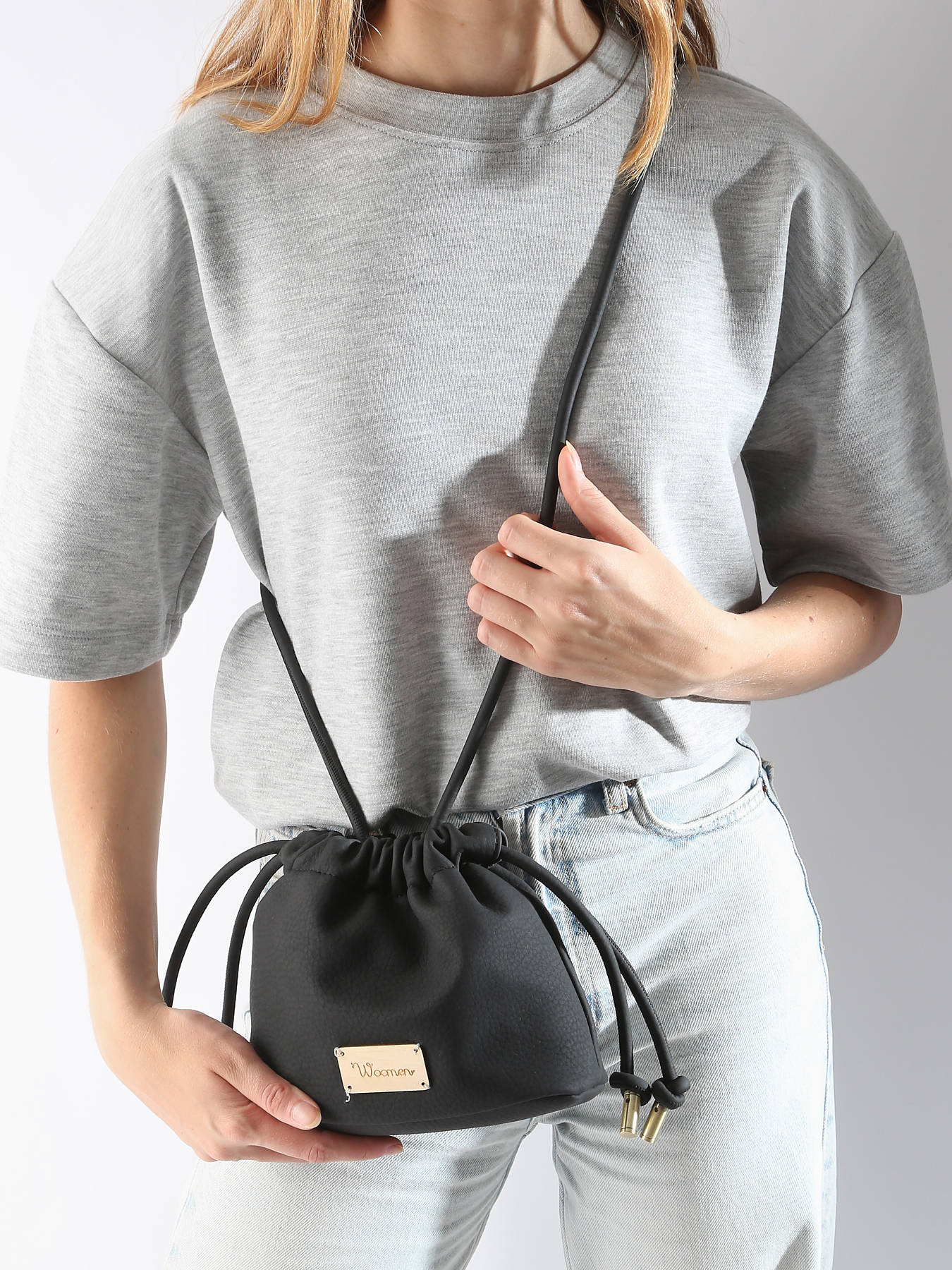 This crossbody bag from WOOMEN's MUSCARI line is made from recycled polyurethane with a grained effect and a peach-skin feel. This small pouch with a puffy design is distinguished by its drawstring detail, allowing you to adjust the bag to your liking. It closes with a magnetic snap and features a zippered pocket and a single compartment inside for practical organization.
