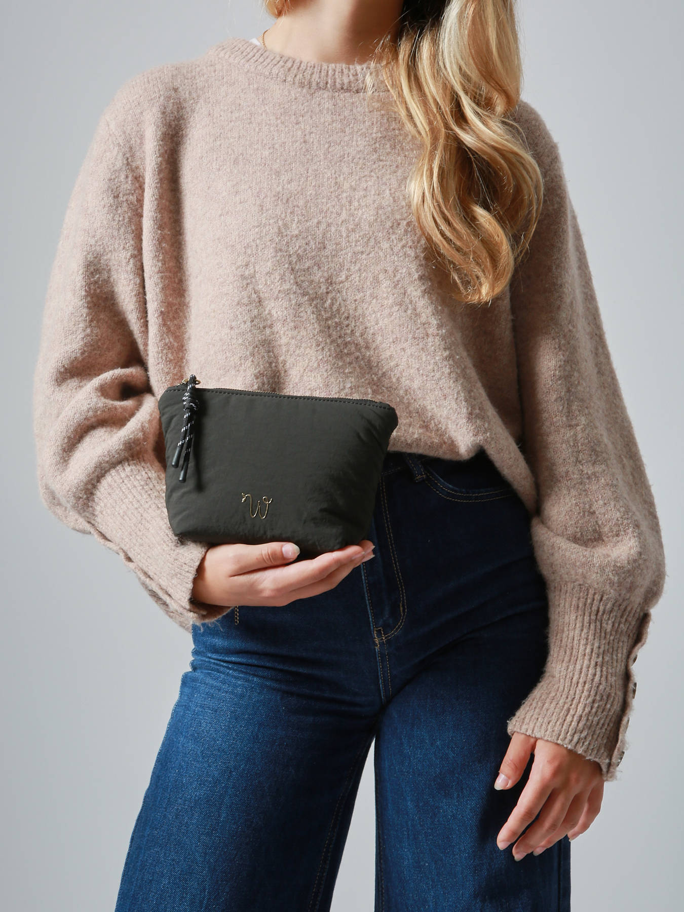 La petite trousse WOOMEN de la ligne PRIMEVERE, réalisée en nylon recyclé, se distingue par son logo en résine dorée W et son cordon fantaisie. Dotée d’une fermeture zippée sécurisée, elle offre un intérieur doublé en coton et lin avec une poche, alliant praticité et élégance dans un format compact, parfait pour ranger l’essentiel avec style et respect de l’environnement.